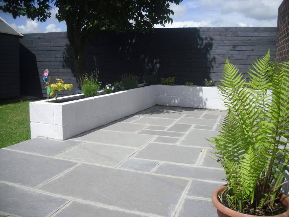 Patio, new fence and block planter built at a property in Carlisle covering up an old foundation for a garage.